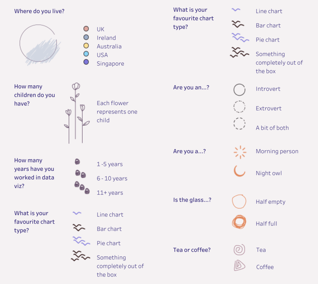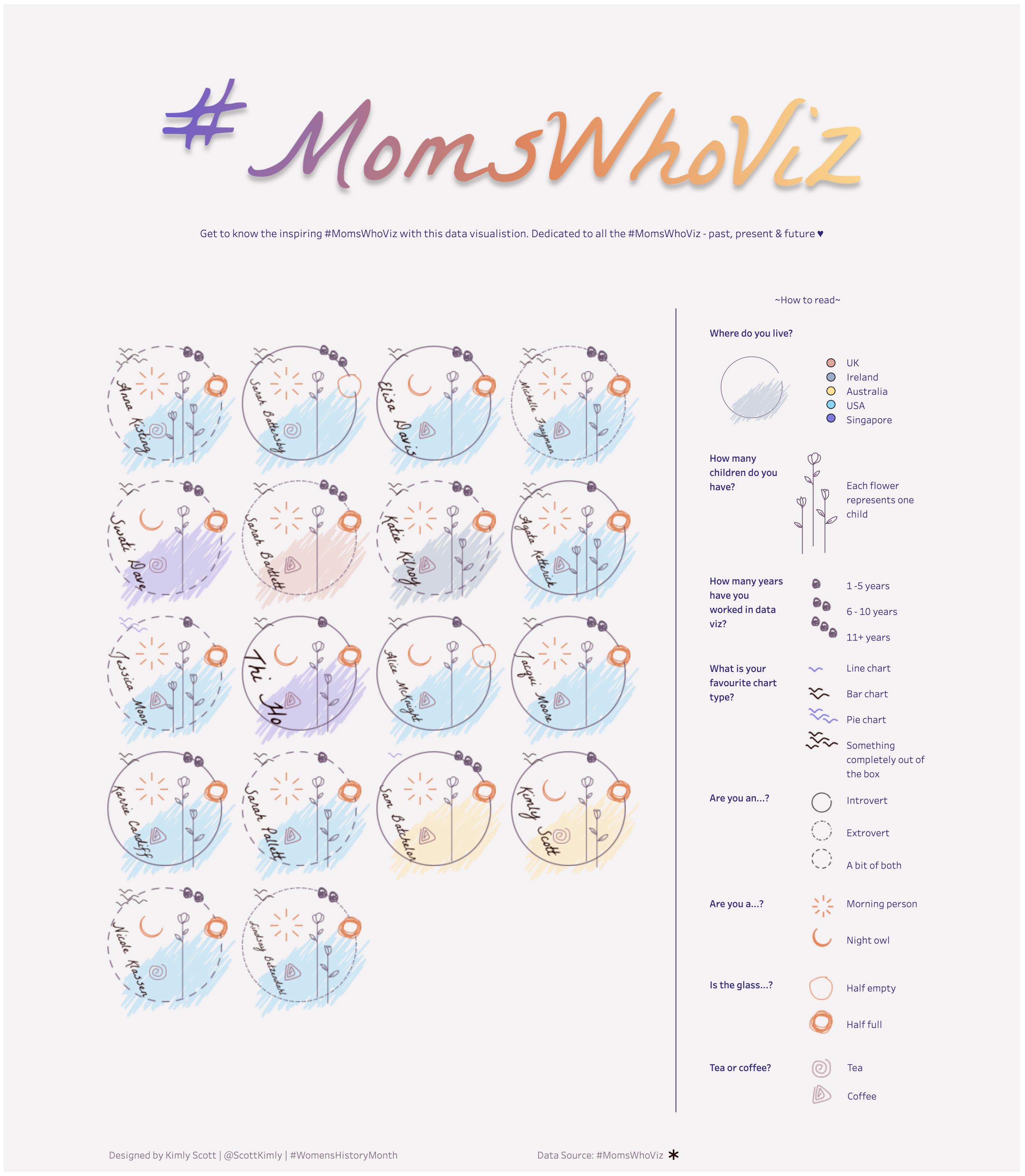 #MomsWhoViz is a data portrait style viz where each member of the group has their own ‘portrait’. Each portrait is unique to the person as it is made up of data about that person. I asked the group to answer some questions via a Google Form and used this data as the basis for the viz.