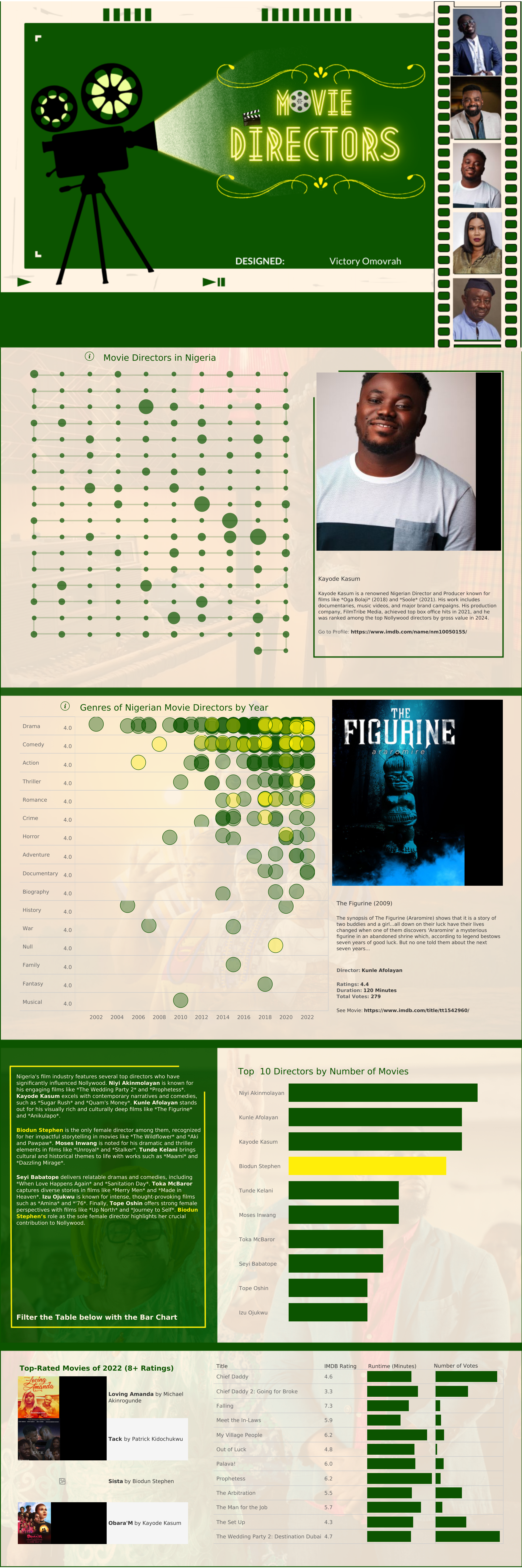 The green color scheme was intentional—it represents the Nigerian flag, symbolizing the nation’s natural wealth and growth. I incorporated film elements like the projector and film reel to give the visualization a classic movie theme, reminding viewers of the cinematic world we’re exploring. The use of directors’ profiles and biographies was crucial because I wanted to put a face to the names that have shaped the industry, especially with the timeline chart linking directors to their work.