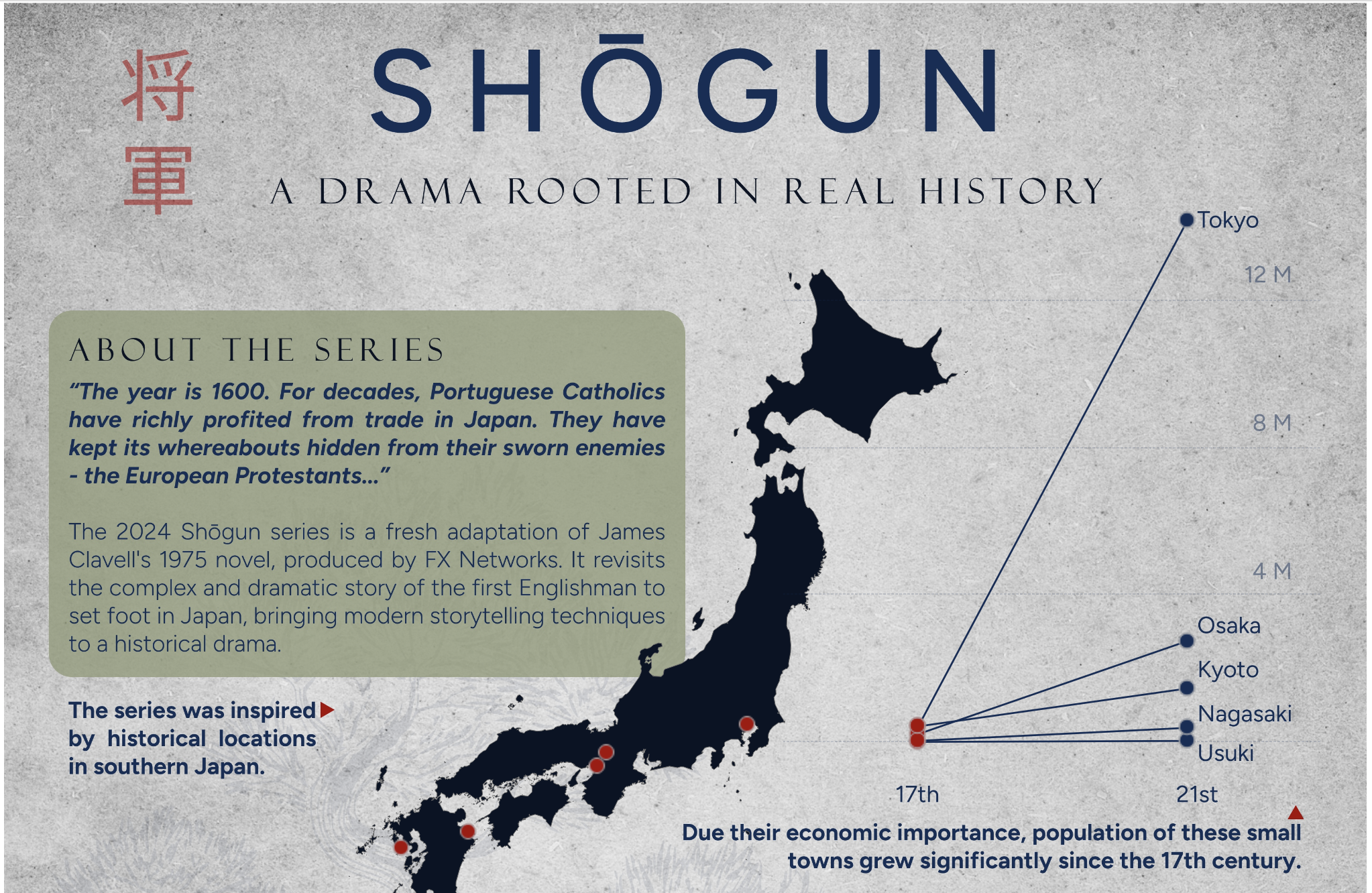 Lilla Rasztik’s beautifully designed viz about the TV series Shogun was a delight to explore. All the elements from the maps, to the colour choice tie together splendidly to take you into the world of the TV series. This viz has inspired me to add Shogun to my watch list.